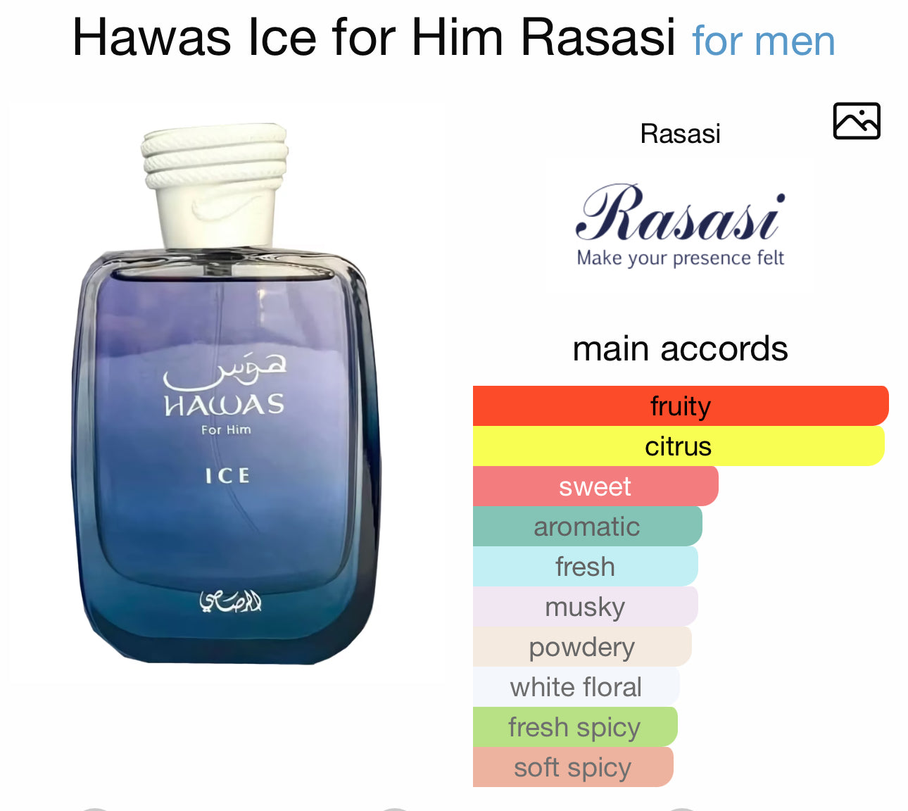 Hawas Ice for Him by Rasasi is a Aromatic fragrance for men. This is a new fragrance. Hawas Ice for Him was launched in 2023. Top notes are Apple, Italian Lemon, Sicilian Bergamot and Star Anise; middle notes are Plum, Orange Blossom and Cardamon; base notes are Musk, Amber, Moss and Driftwood.