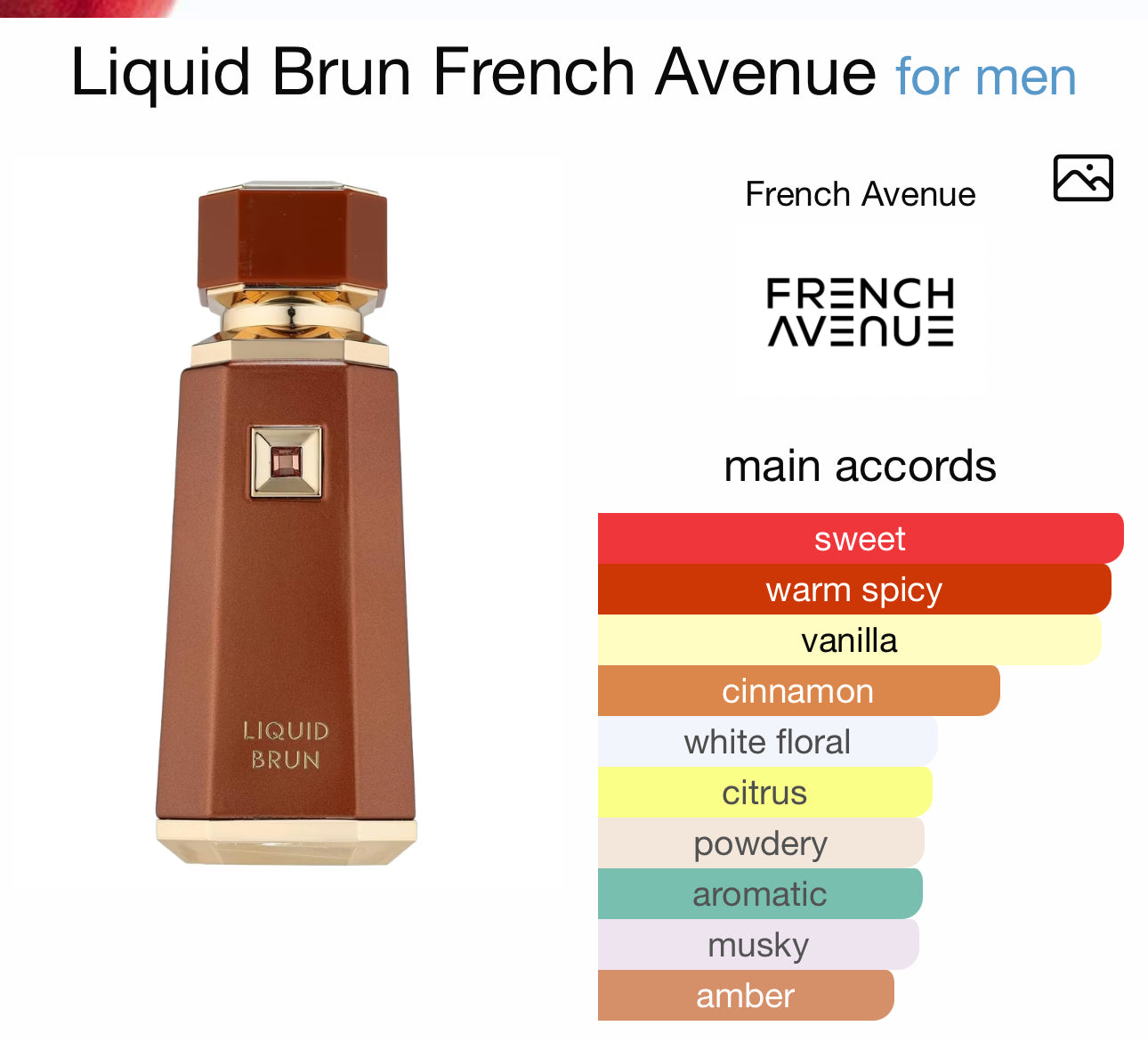 Liquid Brun by French Avenue is a Woody fragrance for men. This is a new fragrance. Liquid Brun was launched in 2024. Top notes are Cinnamon, Orange Blossom, Cardamom and Bergamot; middle notes are Bourbon Vanilla and elemi; base notes are Praline, Ambroxan, Guaiac Wood and Musk.